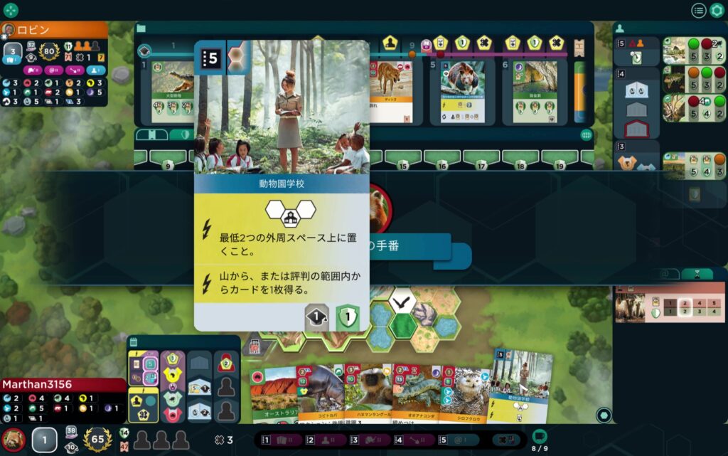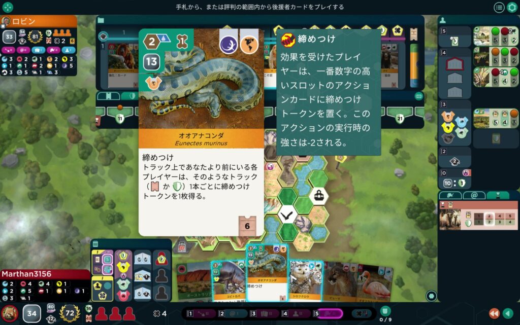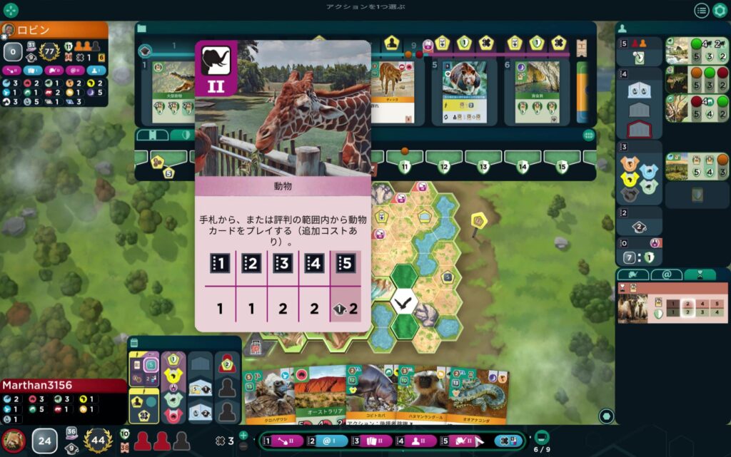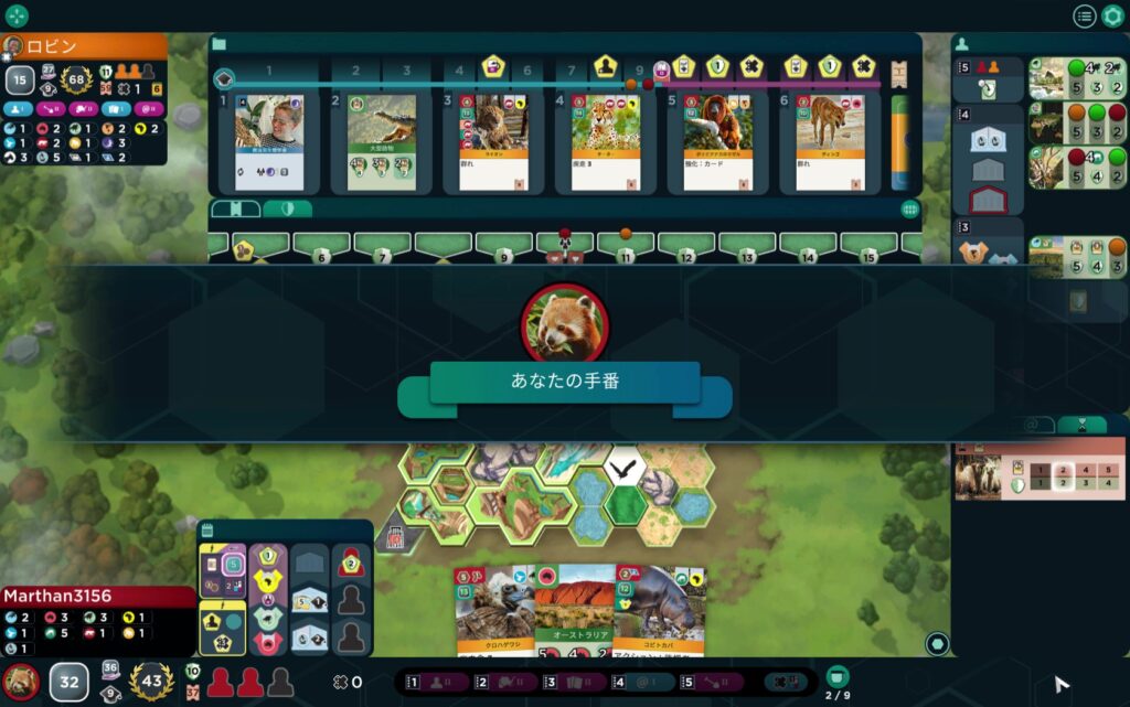 ディスプレイのディンゴを置けば「オーストラリア5」の条件が達成できることも頭から抜け落ち、コビトカバとオオアナコンダのどちらを置くかで長考💦