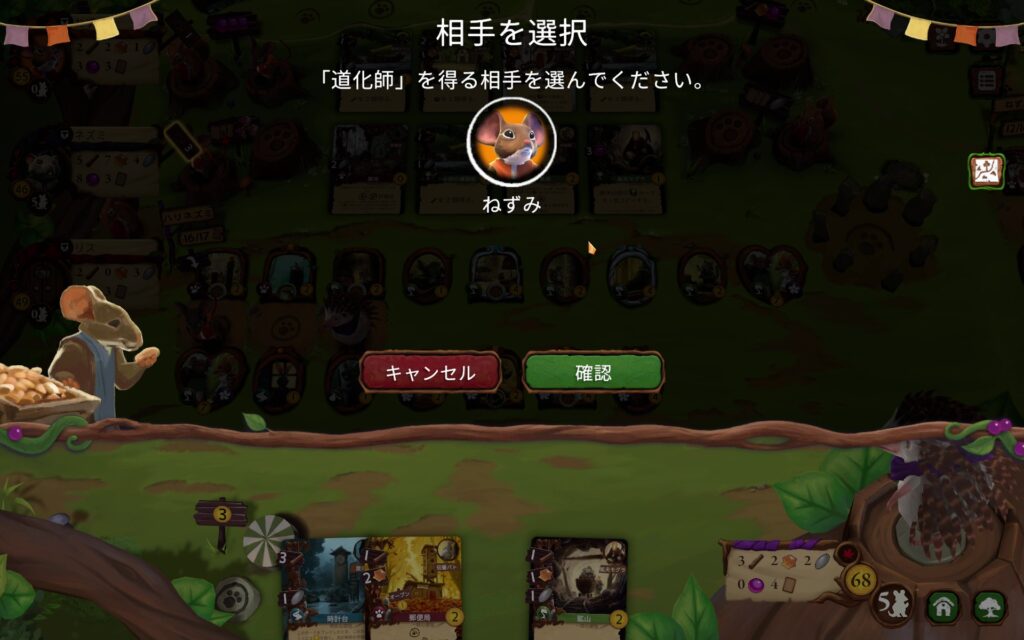 資材はじゅうぶん。手元のカードも充実。高得点のカードだけでなく、対戦プレイヤーを直接攻撃できる道化師まで手に入りました。