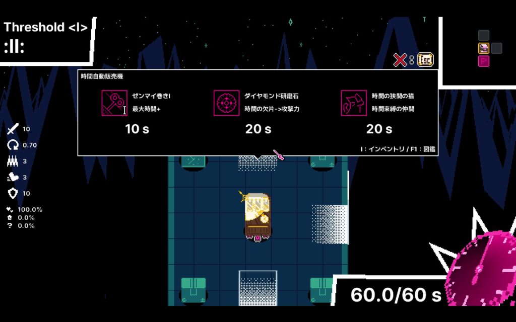 止められる時間、体力、アイテム購入の費用はすべて「時間」で管理されます。アイテムは強力なものが多いですが、時間が大幅に減ります。敵を倒すと少し時間が回復するので、残り時間を見ながらアイテムを揃えていくことになります。