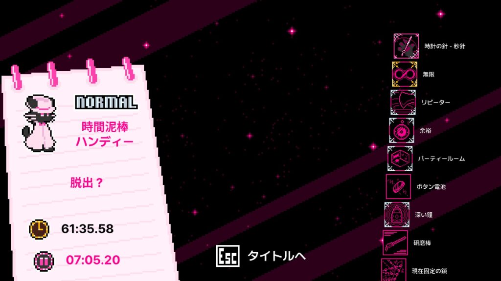 持ち時間の上限を無くせるアイテムが手に入り、ラスボス戦までに200秒くらいの時間が貯まっていましたが、クリア時の残り時間は3秒を切っていました😅