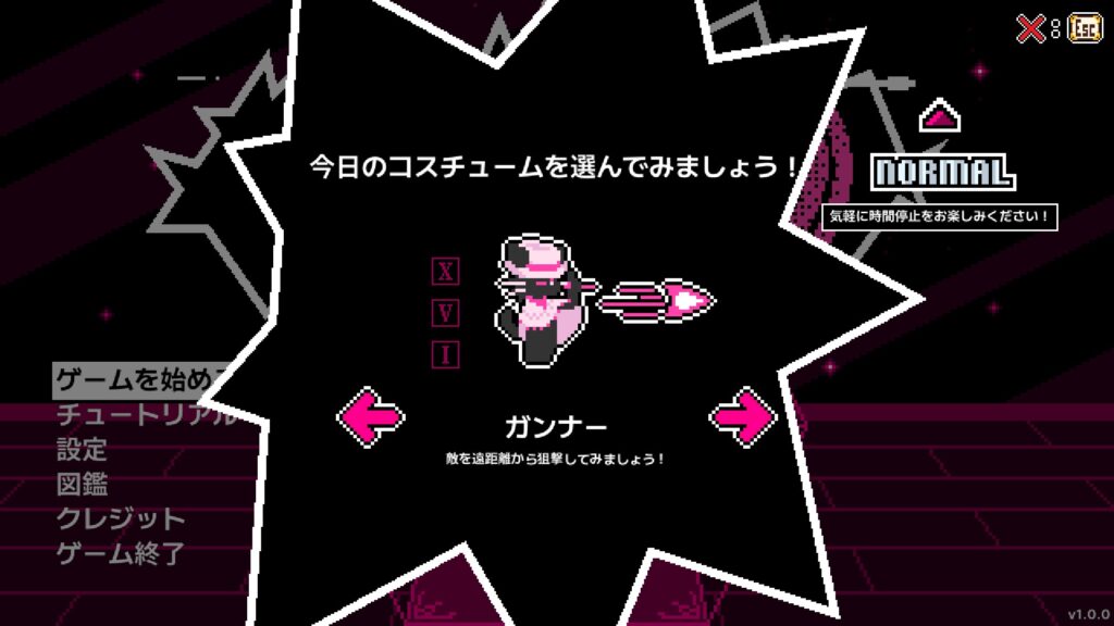 敵の攻撃を(場合によっては時間を止めて)避けながら倒すゲームです。